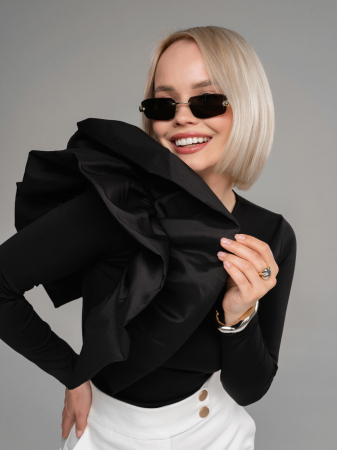 Женский лонгслив из бифлекса черного цвета с длинными рукавами прилегающего силуэта от российского производителя "FiftyPates". Модель выполнена из плотного матового синтетического полотна , который не теряет форму и обладает очень высокой эластичностью. При этом материал не мнется и не нуждается в глажении. На правом плече объемный атласный волан, который придает элегантности вашему образу. из бифлекса черного цвета Лонгслив женский красиво облегает фигуру и не стесняет движений. Вы будете выглядеть превосходно в любой ситуации - будь это повседневный или нарядный образ для праздничных и вечерних выходов. Лонгслив женский с длинными рукавами можно носить как блузку с юбкой или брюками. Идеально на весну и лето. Стильный лонгслив создаёт чувственный и эротичный образ, при этом он подчеркнет вашу красоту и индивидуальность.