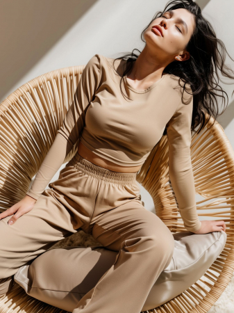 Оригинальный костюм-двойка из кулирки мокко цвета . Укороченный кроп с длинными прямыми рукавами и округлой горловиной. Расширенные брюки прямого силуэта с широким цельнокроенным поясом на резинке. Изделие выполнено из трикотажа премиального качества - ПЕНЬЕ, с содержанием хлопка более 95%