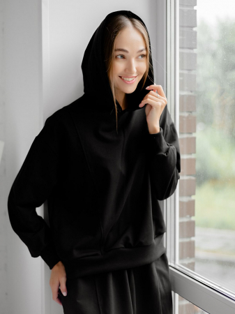 Толстовка свободного силуэта с капюшоном и карманами из футера(3х нитка) черного цвета . Капюшон на подкладе, рукава и низ изделия - на манжетах. Отделка по спине и спереди в виде составных рельефов придает модели стильность и оригинальность.