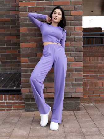 Свободные брюки прямого силуэта из кулирки сиреневого цвета с широким цельнокроенным поясом на резинке. Изделие выполнено из трикотажа премиального качества - ПЕНЬЕ, с содержанием хлопка более 95%