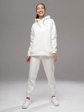 Женская толстовка из футера с начесом белого цвета в стиле "оверсайз" свободного силуэта с капюшоном и длинными рукавами. Карманы в боковых швах. Капюшон объемный двойной. По низу рукавов - резинка, низ изделия на поясе из основного полотна. Изделие выполнено из трикотажа премиального качества - ПЕНЬЕ, с содержанием хлопка более 80%