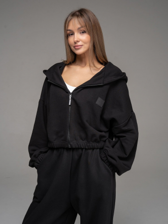 Толстовка на молнии из футера(3х нитка) черного цвета , с капюшоном. По низу изделия и рукавов-резинка.