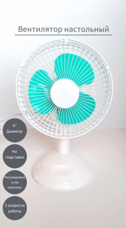 Вентилятор настольный DC-017 в бело-зеленом цвете диаметром 15 см, станет незаменимым помощником на рабочем месте, дома или в офисе в жаркие дни.