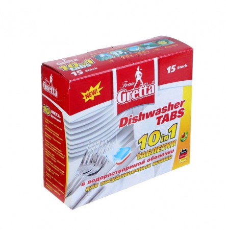 Таблетки для посудомоечных машин Frau Gretta 10 в 1, в растворимой оболочке, 15 шт. Таблетки для посудомоечной машины в водорастворимой оболочке в количестве подходят для всех типов посудомоечных машин.