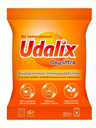 Udalix Oxi Ultra - универсальный кислородный пятновыводитель. Надежное и сильное средство, которое можно применять по всему дому. Удаляет трудно выводимые пятна с одежды, белья, обивки мебели, салона автомобиля, ковров, линолеума, пятна от травы, крови, зеленки, йода, вина, плесени, пищи, а так же от масел, смол, гудрона и т.д.Может использоваться как для предварительного замачивания белья, так и для стирки вместе со стиральным порошком для максимального удаления сложных пятен. Отбеливает белое бельё, сохраняет и освежает краски цветного, нейтрализует запахи и придаёт свежесть, бережно сохраняет структуру ткани.