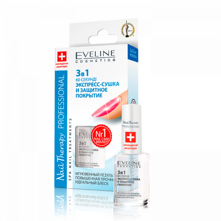 Сушит лак в течение 60 секунд, закрепляет и придает ему блеск. Образует на поверхности ногтей защитный слой, который предохраняет лак от повреждений и поддерживает его прочность в течение 7 дней. Содержит фильтры, препятствующие потере цвета и блеска.