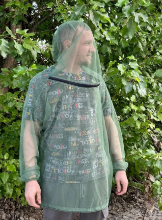 Одевается поверх одежды, универсальный размер, подойдет на любого, сделано в Финляндии, очень рекомендуем, спасает и от комаров и от мошек, гнуса всякого вредного, пчел и ос.