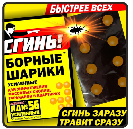 Это самое известное народное средство от тараканов, его использовали еще наши бабушки. В него входит настоящая борная кислота и фирменная пищевая приманка с ядом. Так что теперь это старое испытанное средство по уничтожению тараканов стало еще более эффективным и безотказным. Шарики следует вынуть из упаковки и разместить в местах появления и передвижения тараканов. Желательно не помещать в пыльные места. Не допускать контакта с маленькими детьми и домашними животными. После работы вымыть руки с мылом.