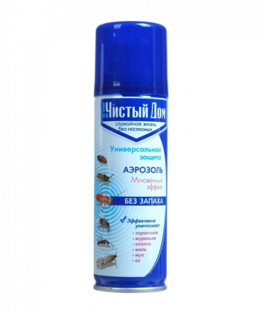 Средство инсектицидное Чистый Дом Аэрозоль Дихлофос от летающих и ползающих насекомых с двойным распылителем представляет собой прозрачную жидкость. Обладает высоким острым и длительным остаточным действием в течение 2-х недель.Состав: содержащую циперметрин (0 ,18%) и тетраметрин (0 ,18%) в качестве действующих веществ, а также синергист пиперонилбутоксид (ППБ), растворители, углеводородный пропеллент и другие функциональные добавки. Не содержит озоноразрушающих хладонов.Назначение: предназначено для уничтожения в помещениях летающих и нелетающих насекомых (синантропных тараканов, постельных клопов, блох, рыжих домовых муравьев (рабочие особи), мух (места посадки), комаров, москитов и бабочек моли) на объектах различного назначения в регламентированных условиях применения в практике медицинской дезинсекции специалистами организаций, имеющих право заниматься дезинфекционной деятельностью, а также населением в быту - строго в соответств