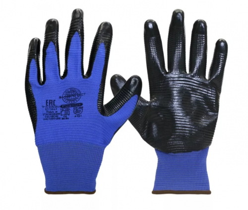 Перчатки из 100% нейлона, рифленое нитрильное покрытие черного цвета.