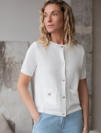 Вязаный кардиган белого цвета из хлопка с коротким рукавом — отличный выбор для весны и лета. Его женственный крой подчеркивает фигуру, а полуприлегающий силуэт создает аккуратный и стильный образ. Укороченный фасон гармонично сочетается с различными вариантами одежды, позволяя создавать как повседневные в стиле old money, так и более нарядные комплекты. Модель выполнена на пуговицах, что добавляет удобства при носке и делает жакет практичным для разных случаев.