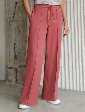 Брюки терракотового цвета прямого кроя выполнены из премиального футера-двухнитки. Лаконичный силуэт поддерживают застроченные стрелки, зрительно вытягивающие силуэт. Удобный пояс на резинке регулируется хлопковым шнурком с золотистой фурнитурой. Наличие эластана в составе изделия гарантирует комфорт и долговечность изделия. Эластичный материал хорошо пропускает воздух, позволяя телу дышать, и легко тянется, не ограничивая движения.