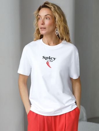 Модная футболка белого цвета привлекает внимание своим интересным дизайном и ярким принтом. Благодаря прямому крою изделие комфортно садится на любую фигуру, в том числе на большие размеры, и не сковывает движений. Круглый вырез подчеркивает современный стиль, а натуральный материал из хлопка с добавлением эластана обеспечивает удобство в повседневной носке и приятные тактильные ощущения. Прочность и износостойкая структура позволяют сохранять свежий внешний вид после множества стирок. Принт в виде перчика и надписи нанесен красками с устойчивым покрытием, перевод надписи: Spice club - Клуб специй. Стильная футболка гармонично вписывается в любой гардероб и подойдет для прогулок, отдыха или неформальных встреч. Благодаря особенностям кроя модель хорошо сидит, скрывая недостатки и подчеркивая достоинства. Яркая футболка идеально сочетается с базовыми вещами, позволяя создавать новые интересные образы каждый день.