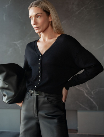 Кардиган тонкой вязки выполнен из нежной пряжи вискозы с нейлоном. Лаконичный силуэт дополнен яркой фишкой изделия - ряд золотистых пуговиц, визуально вытягивающий силуэт. Очень приятное к телу изделие, в котором будет не жарко даже в самые теплые дни. Изделие дополнено логотипом бренда.