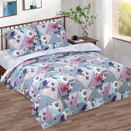 Постельное белье пэчворк всегда в тренде. С давних времен оно пользуется популярностью и является оригинальным декором интерьера. На комплекте из поплина интересный принт, который выполнен в стилистике лоскутной мозаики. Здесь ромбы, словно лоскутки, соединены между собой. Все фигуры в нежных тонах и украшены изящными лепестками.
