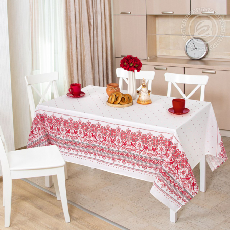 «Вышивка русская» – самобытность и колорит. Традиционные узоры и цвета гармонично сочетаются друг с другом и образуют интересную композицию, которая украсит любой интерьер. Скатерть с русскими узорами, птичками и цветами – это новый тренд, который придаст интерьеру уникальный внешний вид.