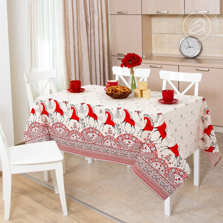 Если Вы любите русские сказки, если с интересом рассматриваете старинные гравюры в музеях, то для Вас наши «Былины» с необыкновенным колоритом. Скатерть из рогожки украшена яркой и самобытной картиной с оригинальной росписью. Здесь и богатырские былинные кони, и орнаменты с уникальными деталями.