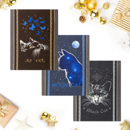 Эксклюзивный дизайн «Лунный кот» погружает в атмосферу тайн и загадок. На темном фоне черный кот – волшебный герой, который появляется в ночи с восходом Луны. Новогодний рисунок выполнен в интересной стилистике с сочетанием темно-коричневого и темно-синего цветов. На каждом полотенце из рогожки – мордочка кота с яркими глазами.