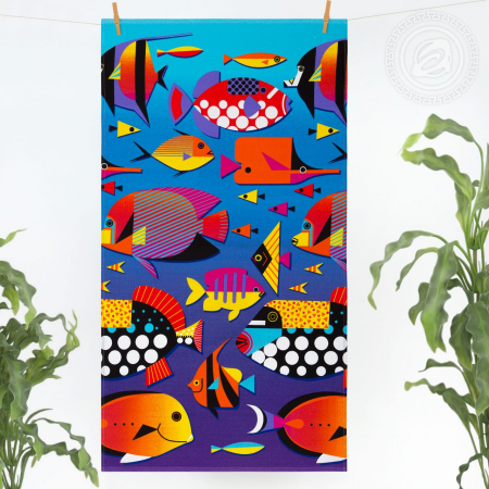 Вафельные полотенца «Дори» летние, разноцветные, красочные. Композиция представляет собой настоящий подводный мир с его самыми яркими обитателями. Здесь красивые рыбки в красных, желтых, сиреневых, оранжевых и розовых цветах. Они напоминают детские аппликации – стильные и оригинальные.