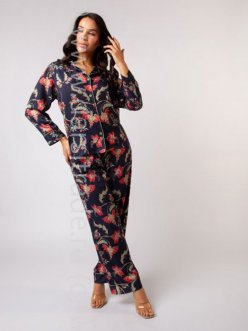 Классический пижамный комплект выполнен из вискозы, мягкая и очень приятная телу,красиво драпируется и практически не мнется. Свободного кроя блуза и прямые брюки утторочены манжетами с контрастной тесьмой.