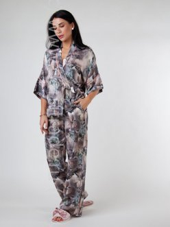 Пижамный комплект - кимоно, выполнен из 100% натуральной нежнейшей шелковой вискозы. Рубашка прямого свободного кроя на запах с рукавами 3/4 на контрастных манжетах. V образный вырез отторочен контрастным кантом. Брюки свободного кроя, с высокой талией, на мягкой резинке, вточные карманы.
