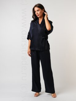 Комплект по типу кимоно, выполнен из 100% натуральной тончайшей шелковой вискозы. Рубашка прямого свободного кроя на запах с рукавами три четверти на контрастных манжетах. V образный вырез оторочен кантом. Брюки свободного кроя, с высокой талией, на мягкой резинке, втачные карманы.