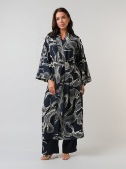 Удлиненный халат классический, свободного кроя без застежек, со съемным поясом для фиксации. Свободного кроя рукава. Планка и рукава с манжетами декорированы тонким контрастным кантом.