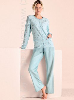 Пижама: кофта с длинным рукавом, на пуговицах, и прямые брюки. Выполнена из интерлока.