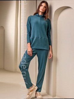 Костюм: кофта с высоким воротом и зауженные брюки. Выполнен из трикотажа в рубчик.