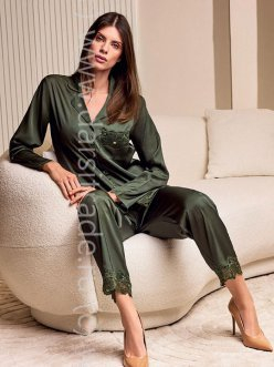 Пижама: рубашка с длинным рукавом и прямые брюки. Выполнена из шелковистого сатина и элегантного кружева. Коллекция "Saten".