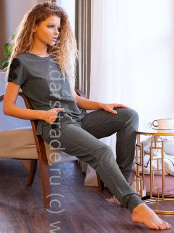 Женский комплект: футболка с коротким рукавом и брюки из мягкого трикотажа «в рубчик» на основе вискозы. МЛаконичный, чуть расклешенный силуэт, приятная струящаяся ткань на основе вискозы, спокойный и благородный серый цвет, сдержанный декор в виде кружевных лампасов на рукавах.