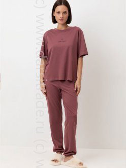 Легкий комплект для комфортного сна и отдыха. Свободная футболка стандартной длины с короткими рукавами. Брюки с манжетами выполнены из трикотажа. Гладкий материал приятен к телу и позволяет коже дышать.