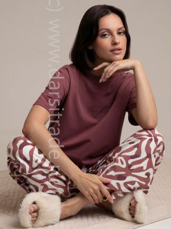 Комплект для сна и отдыха из натурального хлопка с добавлением лайкры. Футболка стандартной длины комфортно садится по фигуре . Укороченные просторные брюки из набивного трикотажа с мягким поясом на резинке .