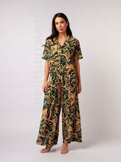 Рубашка по типу жакета, на пуговицах, накладные карманы на линии бедра. Воротник стояче-отложной. Брюки свободные, с карманами и вытачками спереди. Пояс широкий, с частичной резинкой.