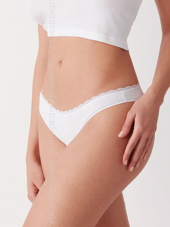 Трусики-бразильяна из мягкого эластичного хлопка тянущегся в 2е стороны. Линия талии обработана кружевной тесьмой 1,3см, линия открытия ноги плоским оверлоком. Высота бочка 5,5см. Низкая посадка талии. Набор из 3 шт.