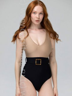 Элегантный женский слитный купальник, комбинированный из двух расцветок: темный низ, светлый верх. Талия подчеркнута эластичным ремешком с пряжкой под кость, придающей образу аристократичности и шика. Идеальная посадка обеспечена выигрышным кроем, закрывающим все проблемные места; подкладкой по всему объему, подтягивающей фигуру и держащей форму; съемными поролоновыми чашками, помогающими создать безупречный силуэт. Есть два варианта расцветки: черный низ с белым или карамельным верхом.