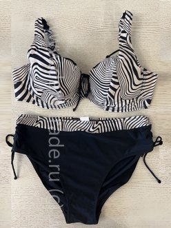 Раздельный купальник. Лиф с мягкими драпированными чашками, на косточках, бретели регулируются по длине, на спине металлическая застёжка. Трусы-слипы однотонные, средней посадки, в верхней части слипов имитация пояса контрастной расцветки.
