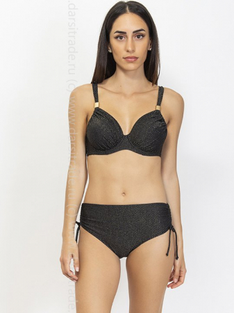 Раздельный купальник: бюстгальтер на косточках с мягкой чашкой, по пройме регулируемая сборка. Бочок усилен костью. Отстегивающиеся бретели с двойным вариантом завязывания. Застежка- поворотный замок. Трусики-слип, высота бочков регулируется кулиской на 5