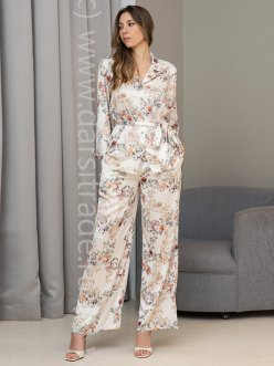 Комплект Mia-Amore состоит из жакета с к рукавом длиной 3/4 и широких брюк. Комплект выполнен из принтованного смесового шелка на матовой основе. По бокам брюк обработаны карманы. Линию талии можно подчеркнуть за счет пояса, который идет в комплекте.