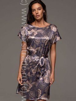 Туника Mia-Amore свободного кроя длиной до колен с цельнокроеными укороченными рукавами выполнена из принтованного смесового шелка. Округлый вырез горловины и низ рукавом обработаны обтачками из принтованного атласа. Туника комплектуется поясом, в боковых швах обработаны карманы.