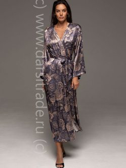 Длинный запашной халат Mia-Amore выполнен из принтованного смесового полотна. Низ рукавов, планка бортов отделаны контрастным кантом. Халат запахивается на пояс, в боковых швах есть карманы.