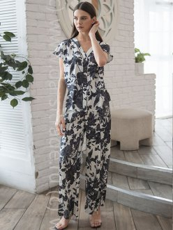 Комплект состоит из жакета с коротким рукавом и широких брюк. Комплект выполнен из принтованного смесового шелка с контрастным кантом в виде отделки. По бокам брюк обработаны карманы. Линию талии можно подчеркнуть за счет пояса, который идет в комплекте.
