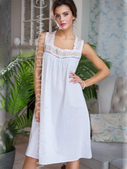 Длинная сорочка Миа-Миа свободного силуэта на широких бретелях выполнена из хлопка. Декором сорочки является вышивка расположенная на кокетке и бретелях. По горловине проходит узкая рюша. Низ кокетки подчеркнут кружевом. Спинка на кокетке, нижняя часть спинки со сборкой.
