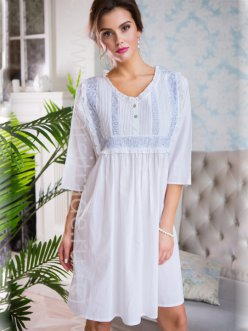 Хлопковая рубашка Миа-Миа средней длины с широким рукавом 3/4 и декором в виде вышивки по лифу. Горловина декорирована узкой рюшей. На полочке расположена застежка-планка на перламутровых пуговицах. По лифу расположены вертикальные отсроченные защипы и ленты с вышивкой. По боковым швам и талии лиф оформлен узкой рюшей. Юбка рубашки на защипах по уровню талии.