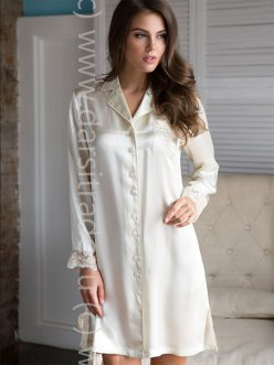 Рубашка средней длины полуприлегающего силуэта из натурального шелка, с отложным воротником, застегивается на пуговицы.