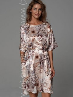 Туника Mia-Amore свободного кроя длиной до колен с цельнокроеными укороченными рукавами выполнена из принтованного смесового шелка. Округлый вырез горловины и низ рукавом обработаны обтачками из принтованного атласа. Туника комплектуется поясом, в боковых швах обработаны карманы.