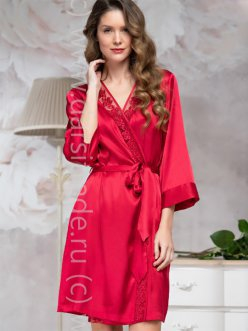 Короткий запашной халат Mia-Amore с рукавами 3/4, выполнен из однотонного искусственного шелка. По краям бортов расположена ажурная вышивка на сетке. По бокам обработаны карманы.
