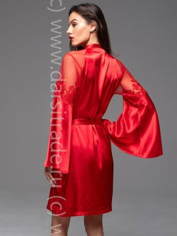 Короткий запашной халат Mia-Amore с широким длинным рукавом длиной. Халат выполнен из однотонного смесового шелка с кружевными вставками по верхней части рукава. По бокам изделия расположены карманы.
