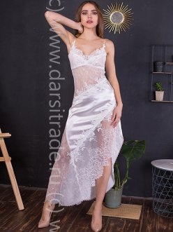 Платье домашнее женское выполнено из кружевного полотна в сочетании с шелком. Модель полуприталенного силуэта длиной макси. Диагональный крой комбинирован кружевным полотном и полосами шелка-сатина. Лиф на тонких регулируемых бретельках украшен кружевом.