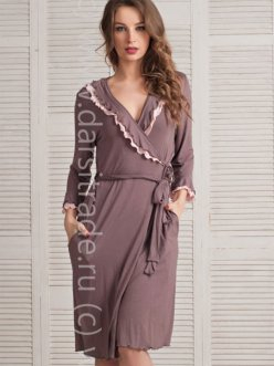 Халат Mia-Mella с запахом выполнен из мягкого принтованного вискозного трикотажного полотна. Вырез горловины халата и низ рукавов декорированы двойной рюшей. В боковых швах халата находятся карманы. Модель дополнена поясом.